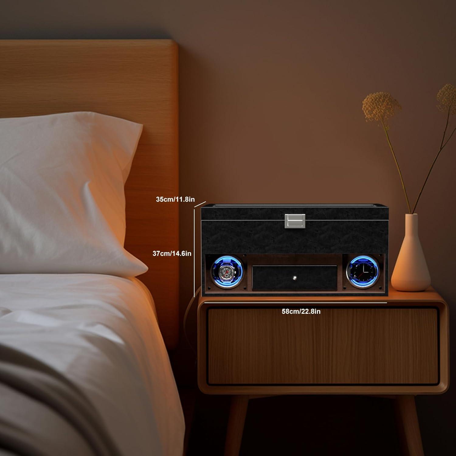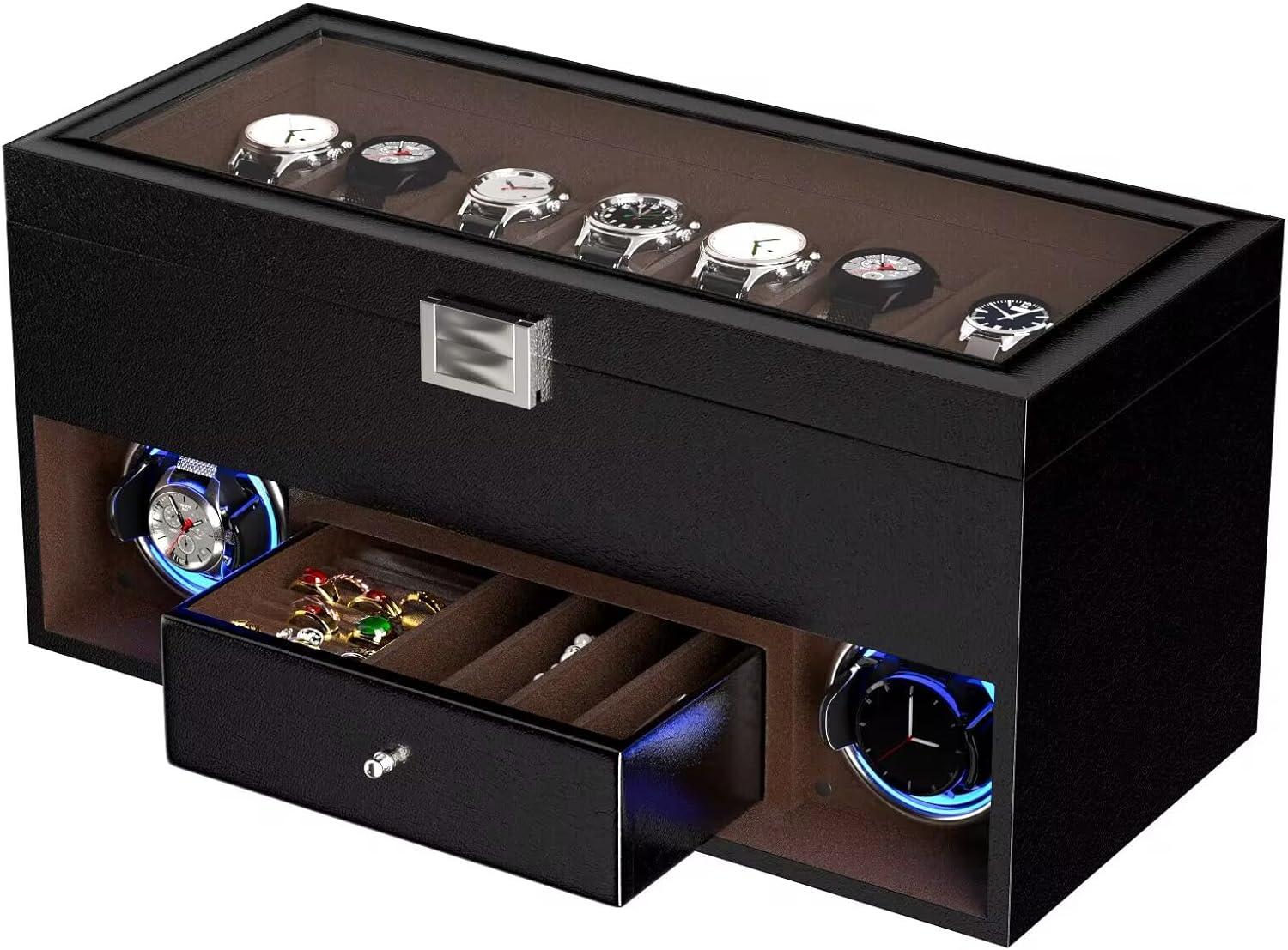 imageDUKWIN 16 Slot Watch Display Case with Watch Winding for 2 Watch Winder with 4 Rotation Mode Adjustable Watch Pillow and Blue LED Light for Watch Lover Multifunctional Watch BoxBlack RD1602 for 2