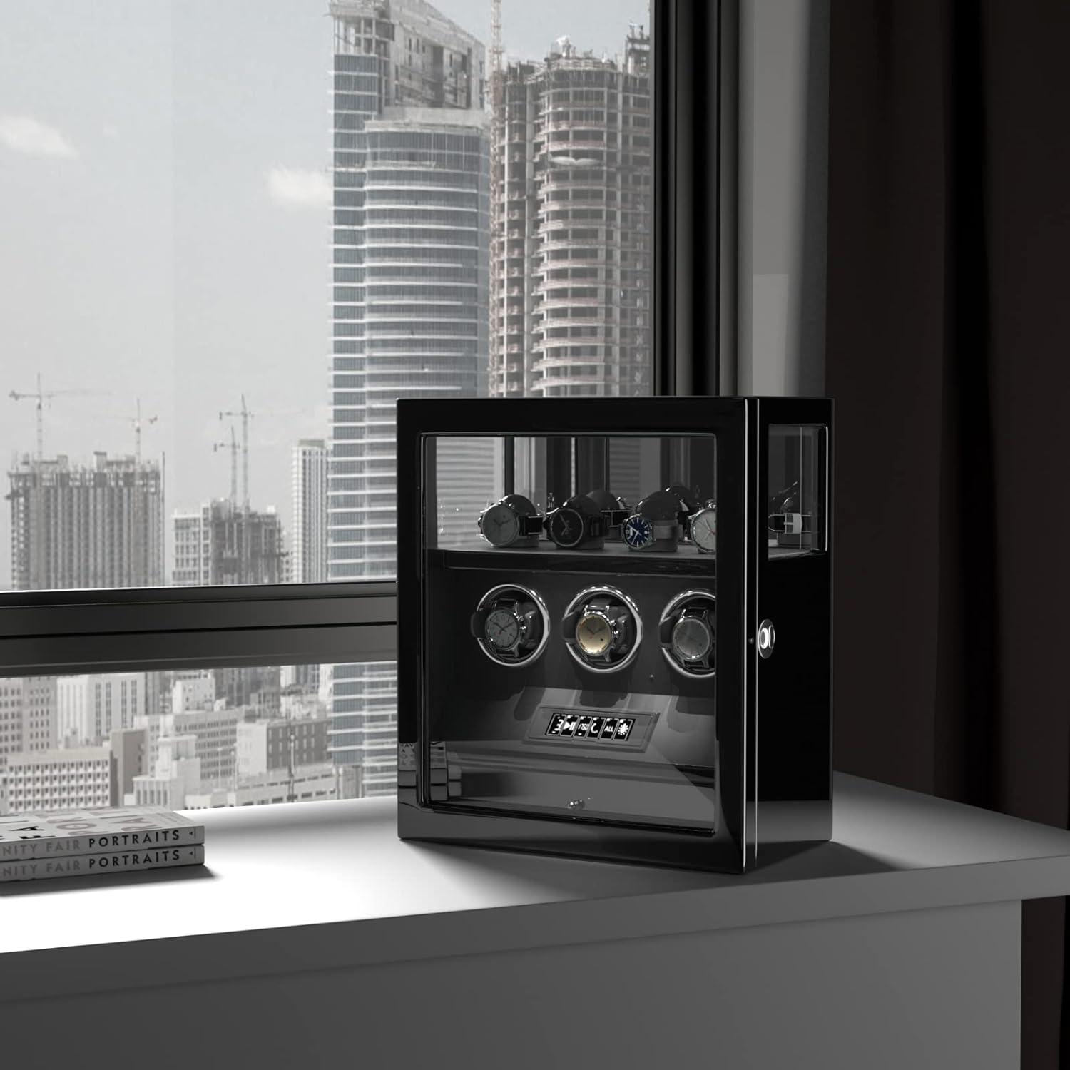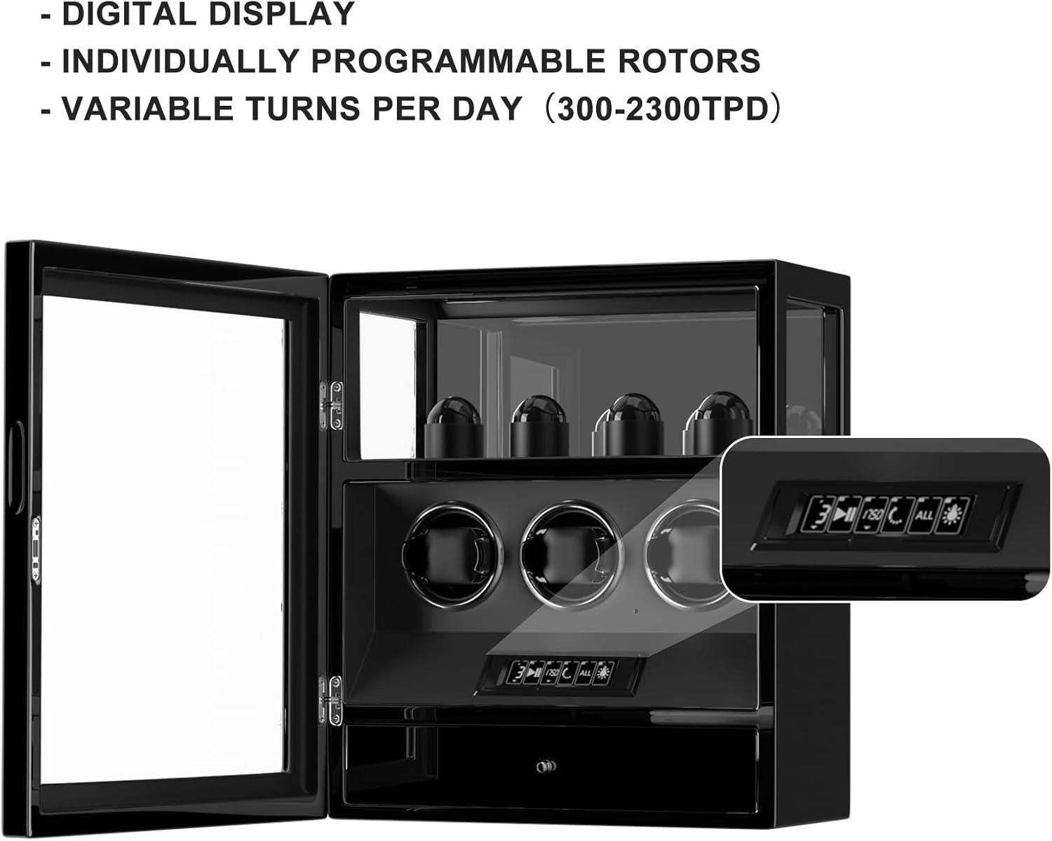 DUKWIN Fingerprint Lock Watch Winder - 300 to 2300 TPD for Automatic Watches, Digital Display & Adjustable Watch Mat(BLACK FOR 3)