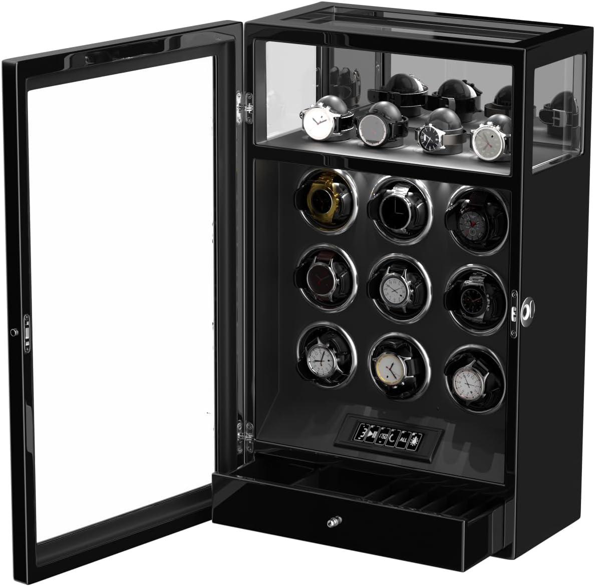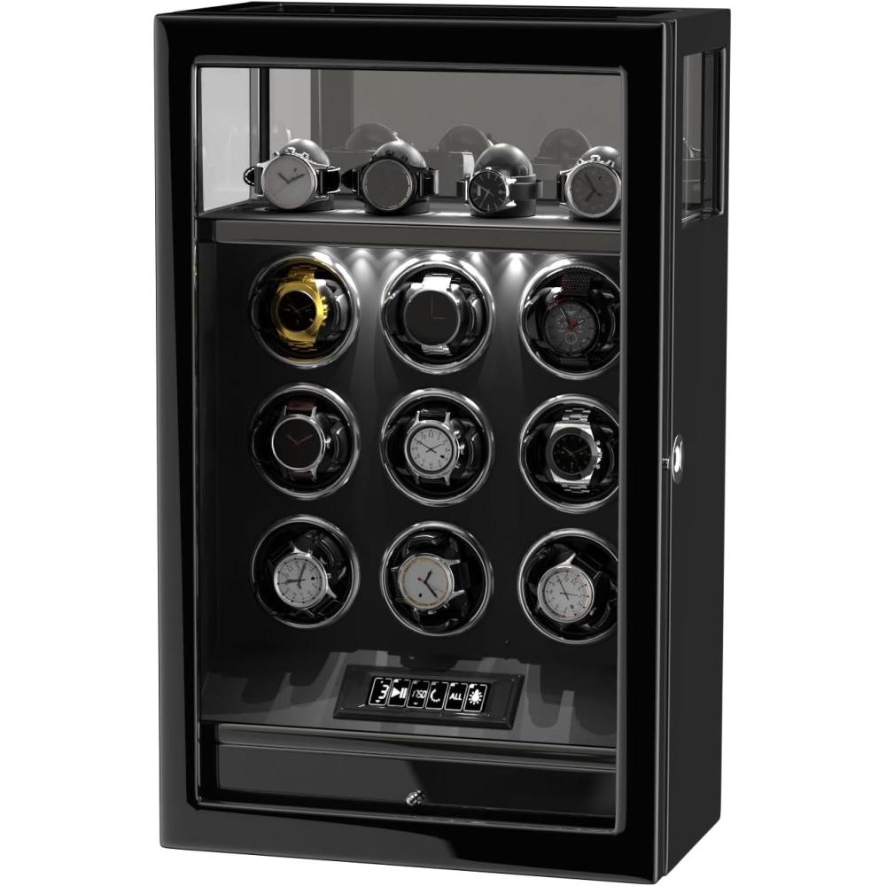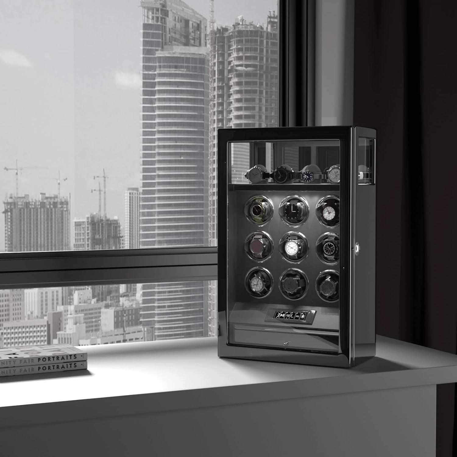 DUKWIN Fingerprint Lock Watch Winder - 300 to 2300 TPD for Automatic Watches, Digital Display & Adjustable Watch Mat(BLACK FOR 9)
