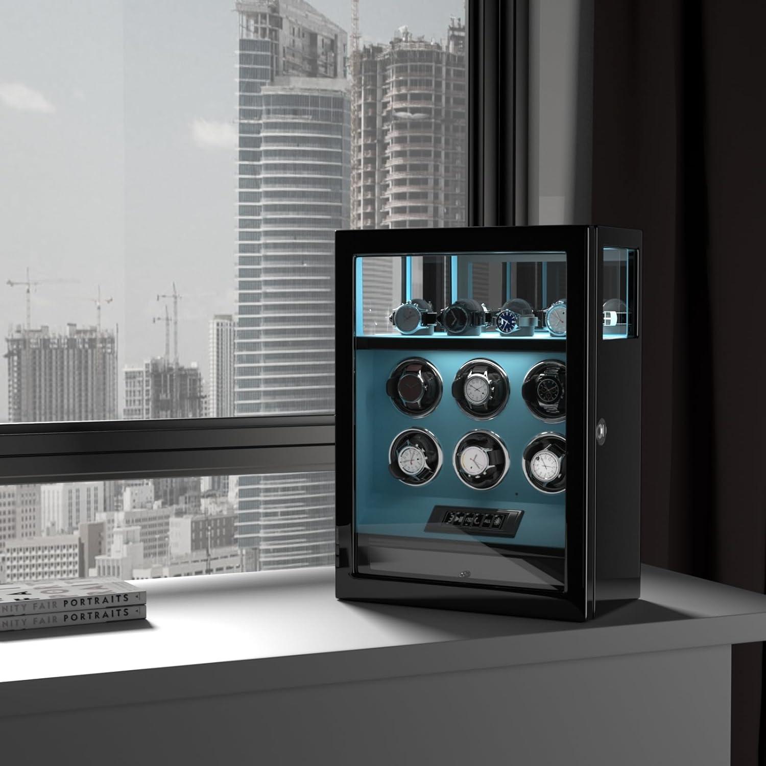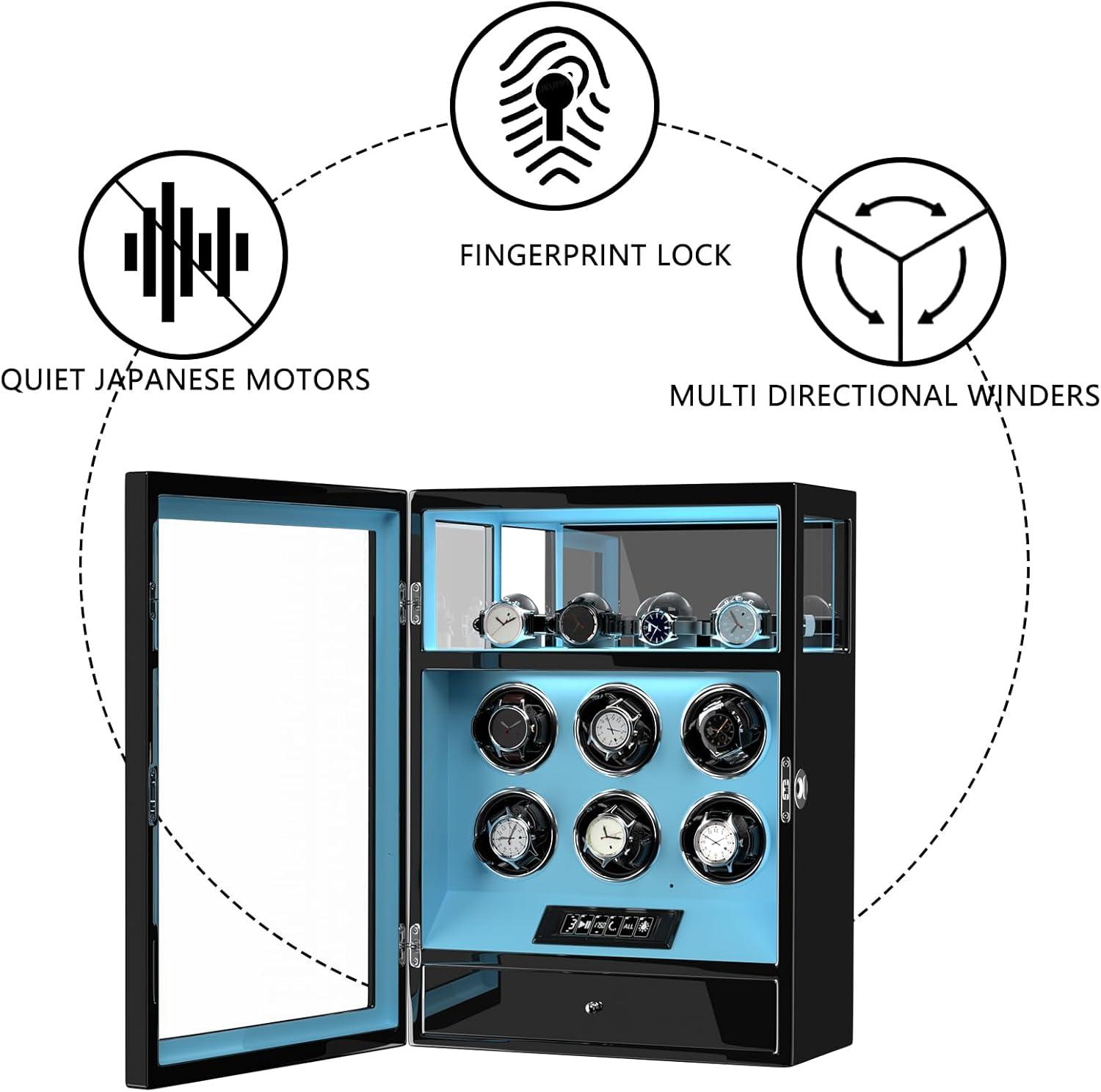 DUKWIN Fingerprint Lock Watch Winder - 300 to 2300 TPD for Automatic Watches, Digital Display & Adjustable Watch Mat(BLUE FOR 6)