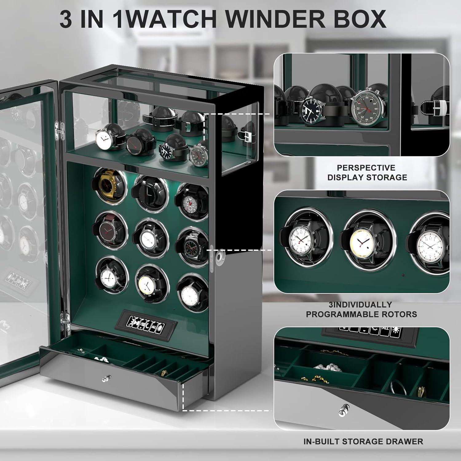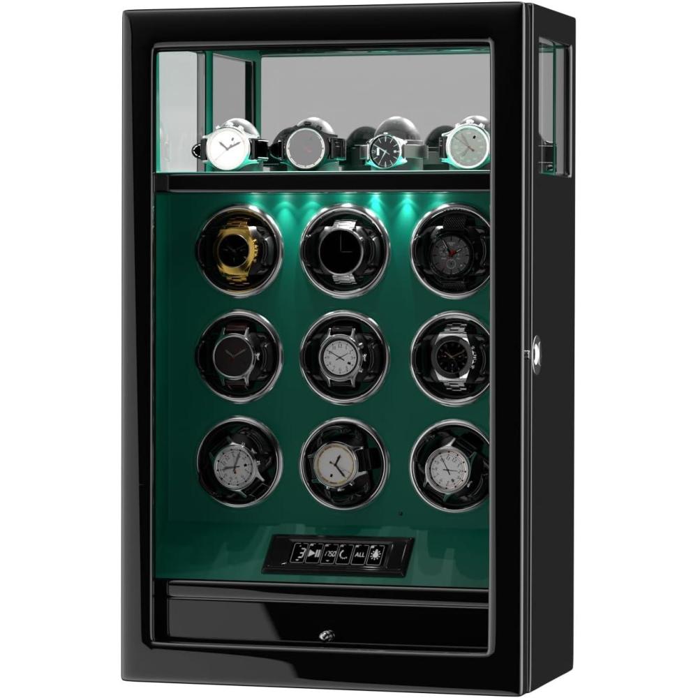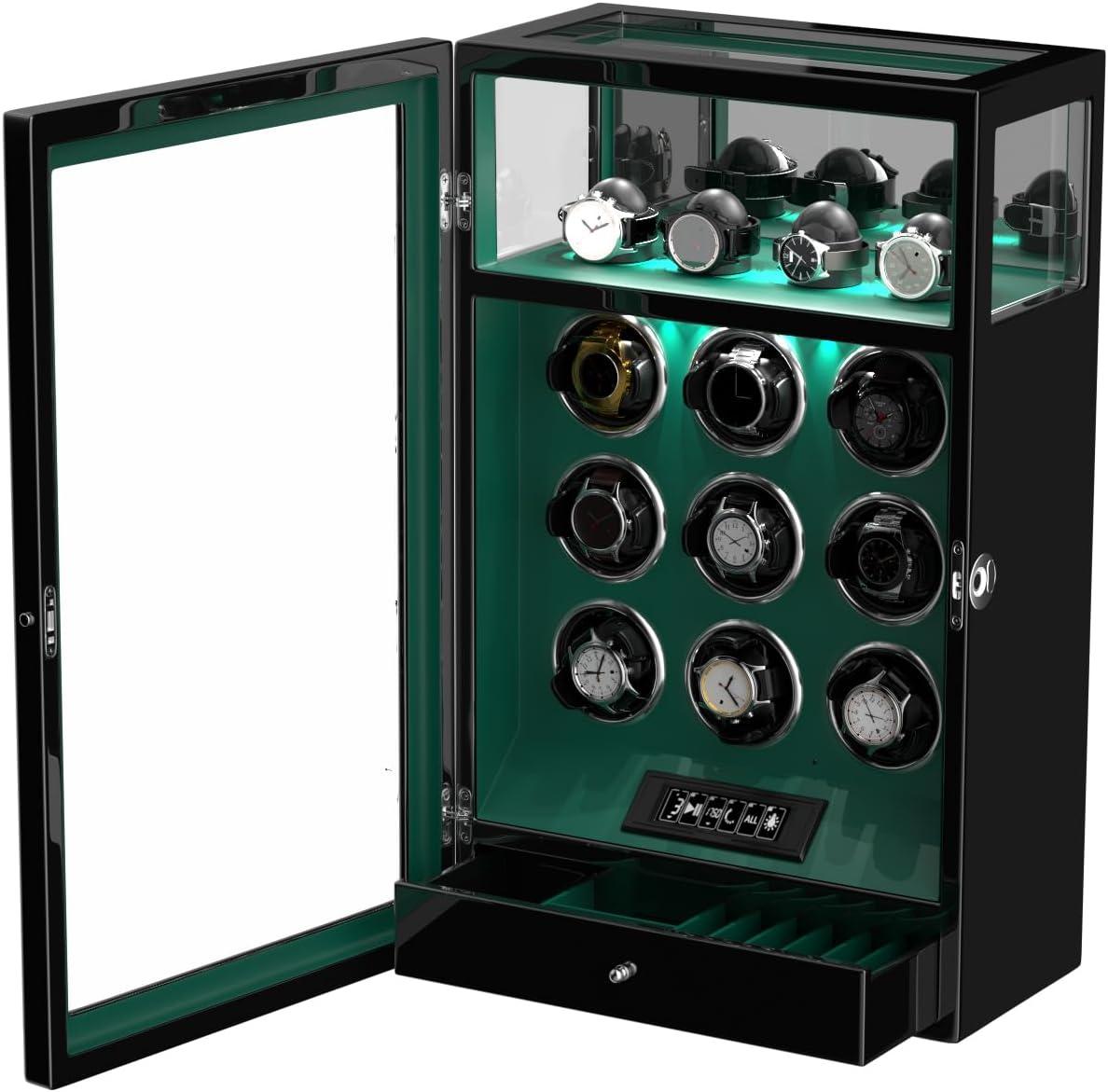 DUKWIN Fingerprint Lock Watch Winder - 300 to 2300 TPD for Automatic Watches, Digital Display & Adjustable Watch Mat(GREEN FOR 9)