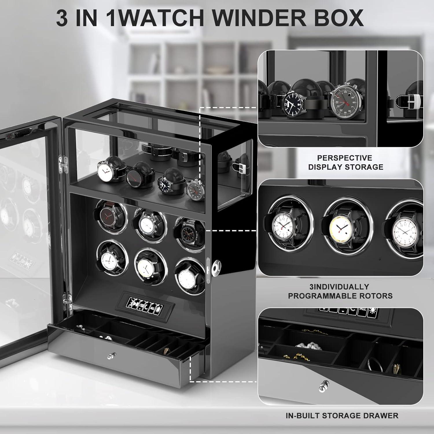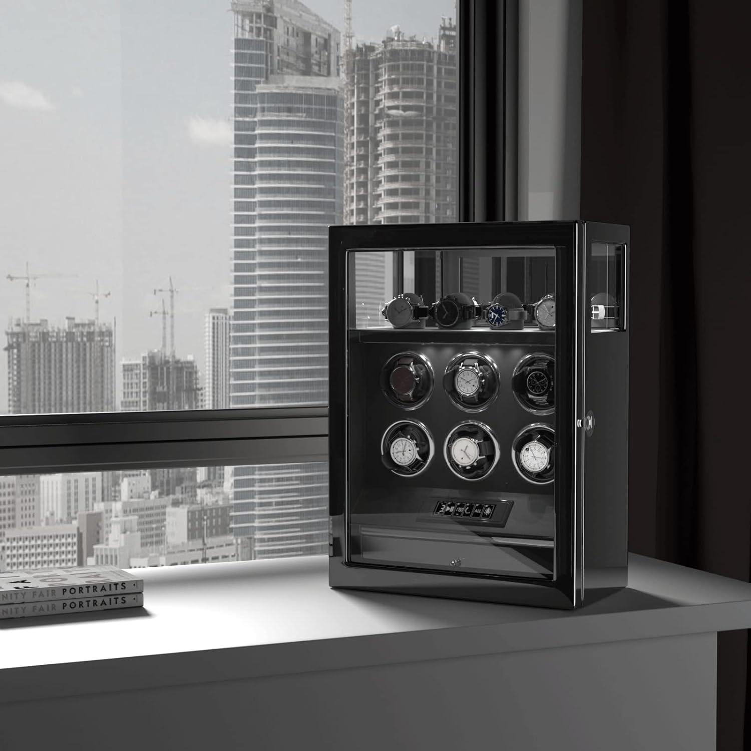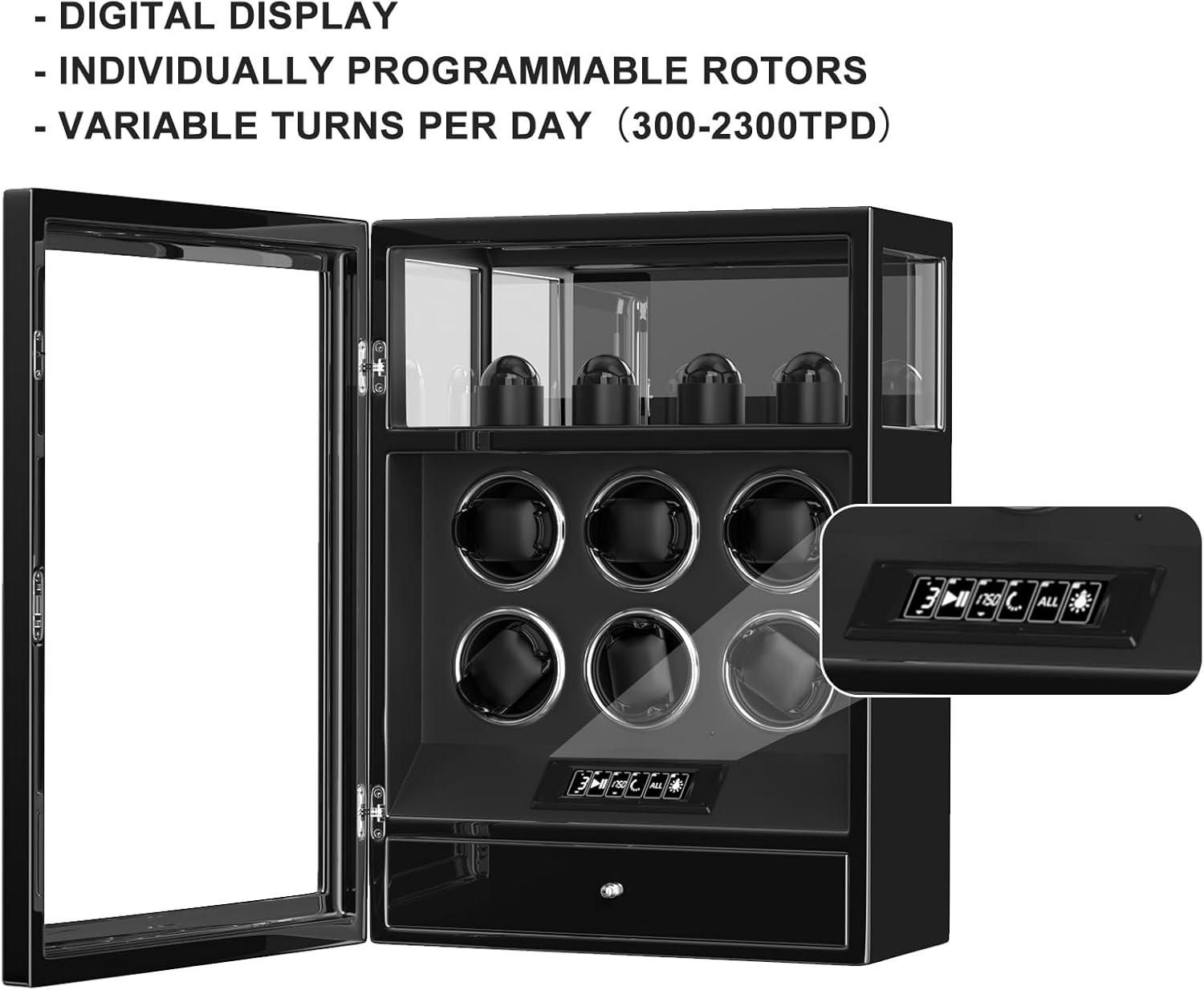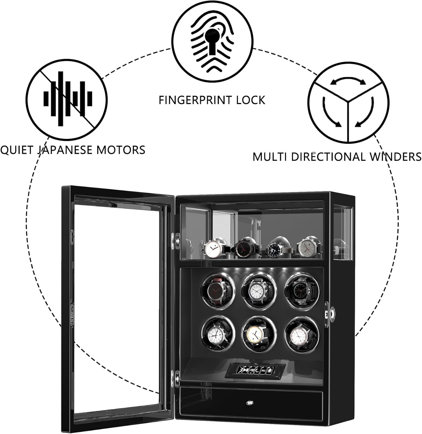 DUKWIN Watch Winder, Fingerprint Lock Automatic Watch Winder for 3/6/9 Watches with 4 Holders,300-2300 TPD,Digital Display, Remote Control,Jewelry Storage and Adjustable Watch Pillow and LED Light(Black Winder for 6)