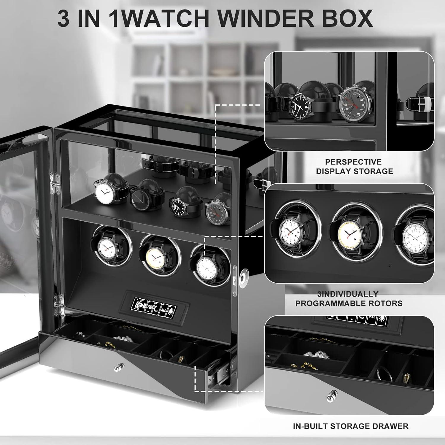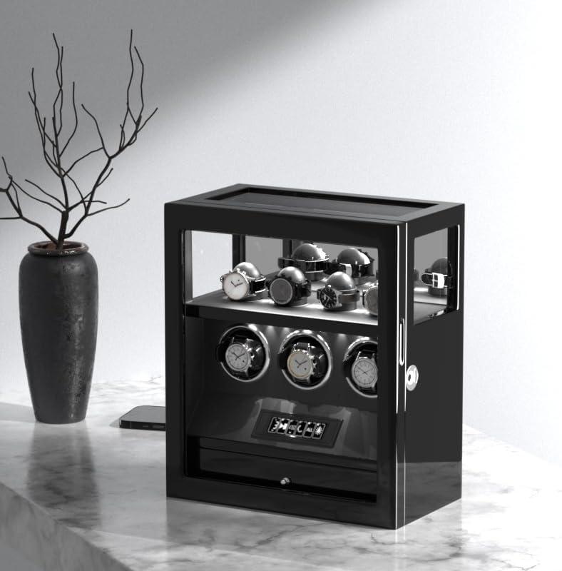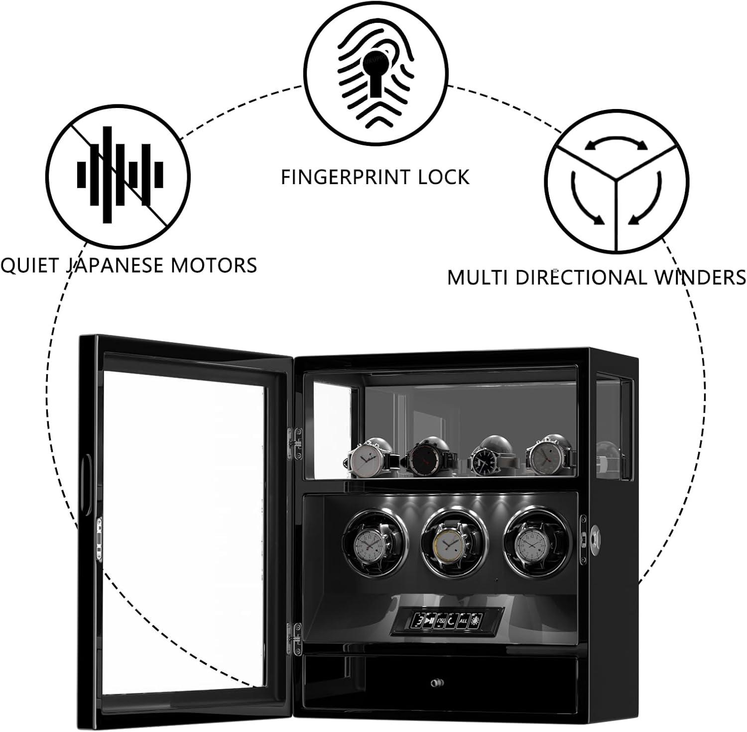 DUKWIN Watch Winder, Fingerprint Lock Automatic Watch Winder for 3/6/9 Watches with 4 Holders,300-2300 TPD,Digital Display, Remote Control,Jewelry Storage and Adjustable Watch Pillow and LED Light(Black Winder for 3)