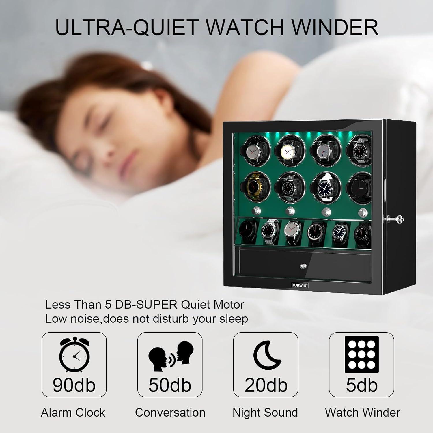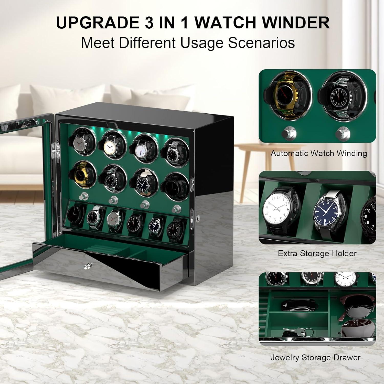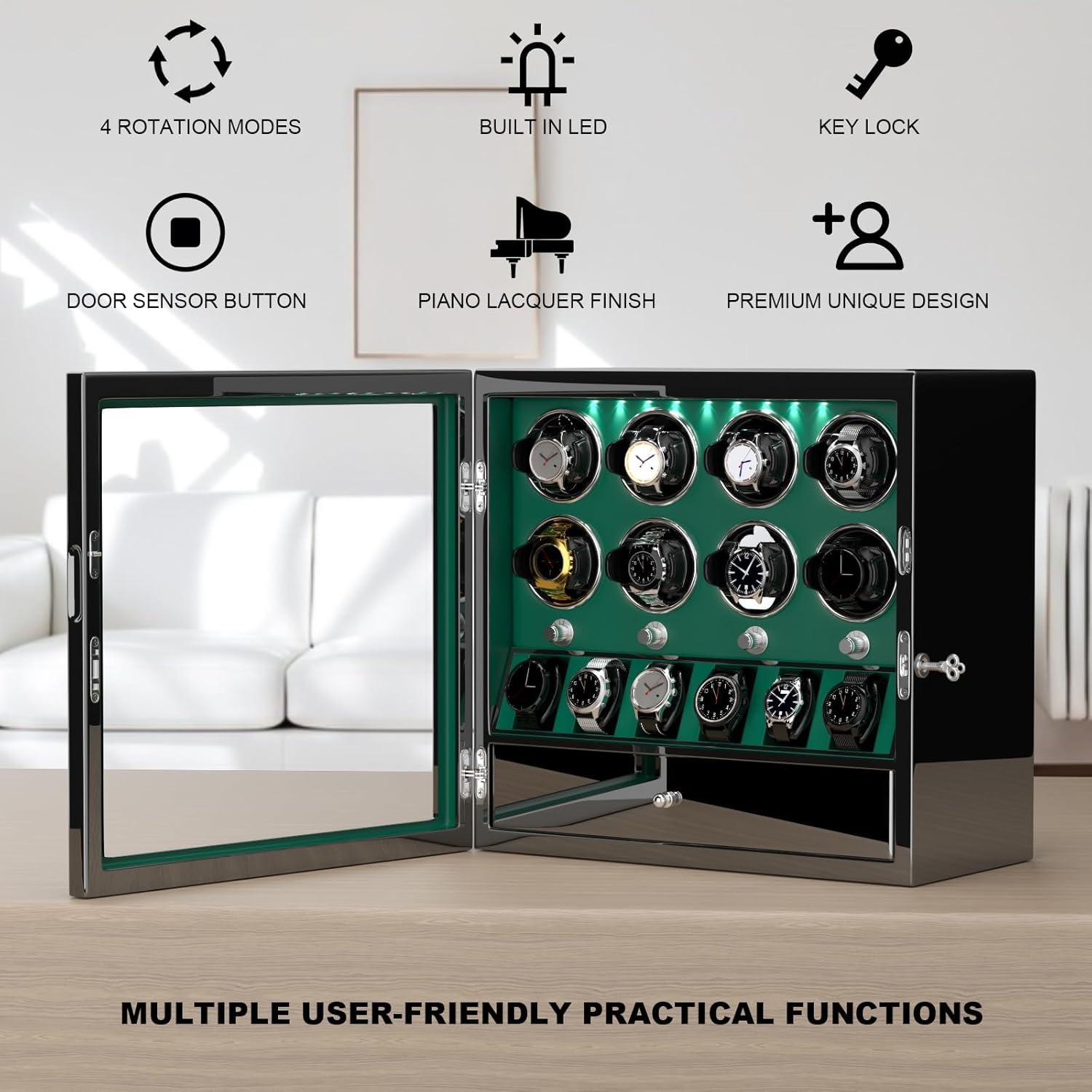 imageDUKWIN Watch Winder for 468 Automatic Watches Lockable Winders with Watch Holders and Jewelry Storage Super Quiet Motor with HighGloss Finish Builtin IlluminationGreen Watch Winders for 8 Watches
