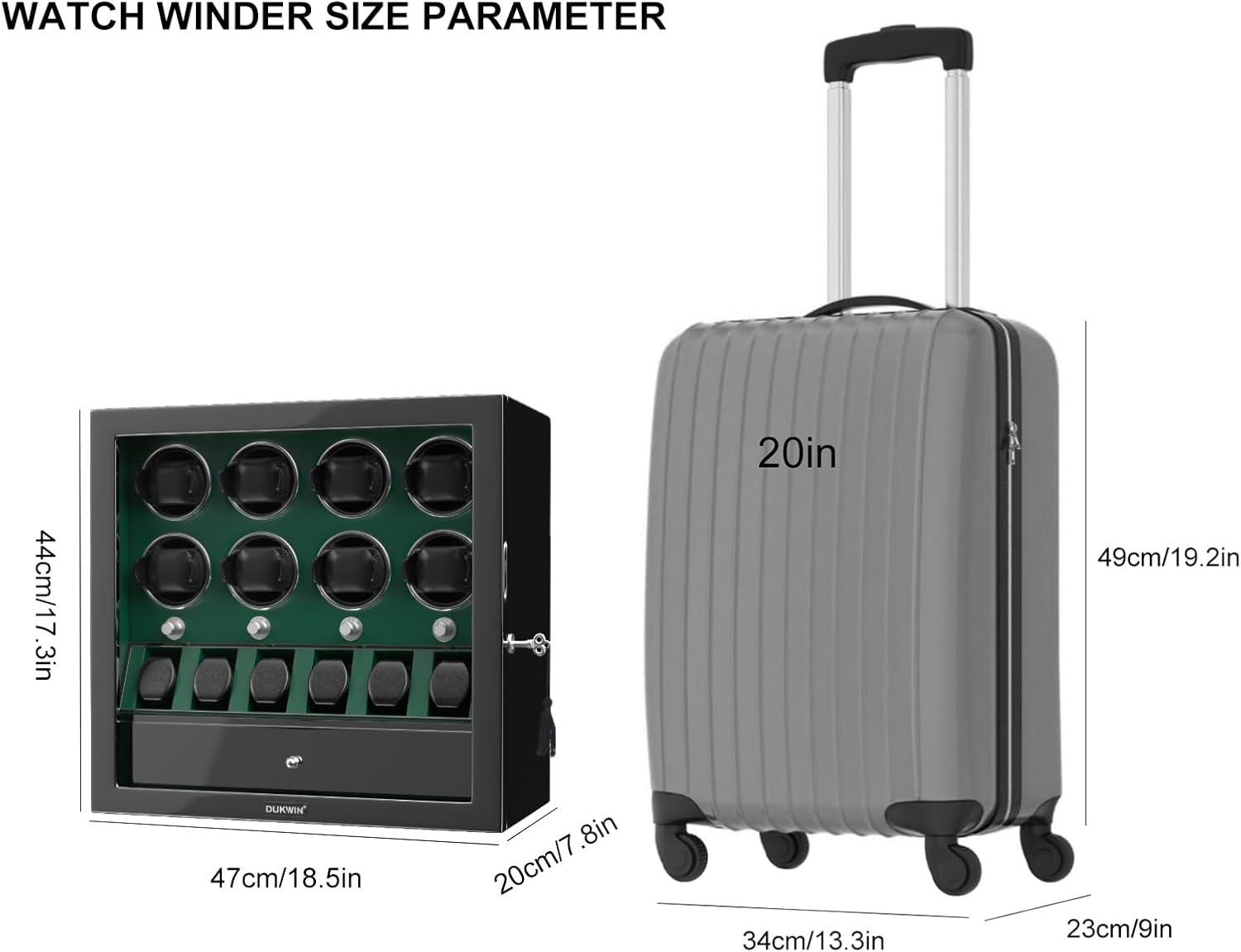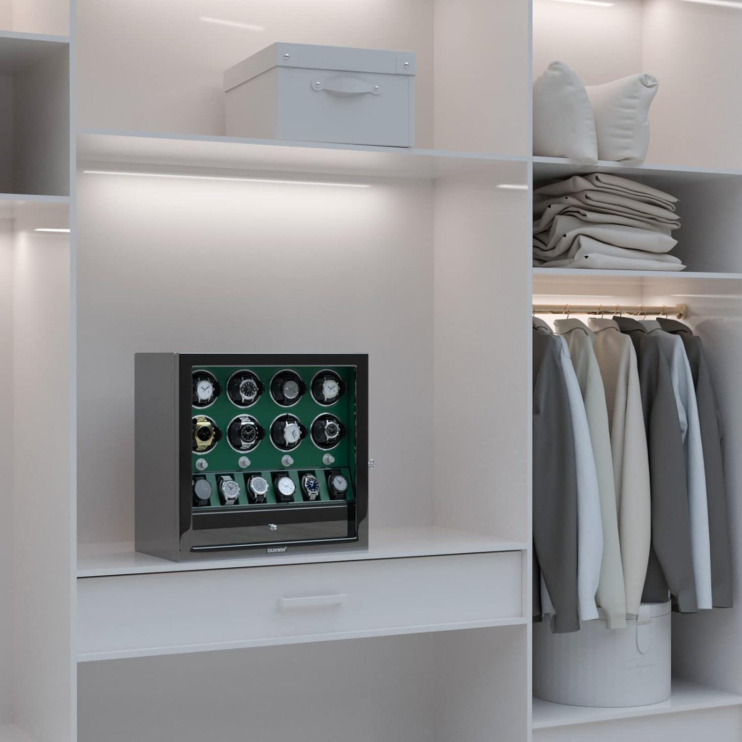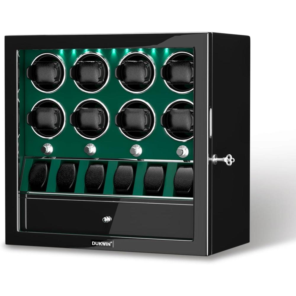 DUKWIN Watch Winder for 4/6/8 Automatic Watches, Lockable Winders with Watch Holders and Jewelry Storage, Super Quiet Motor with High-Gloss Finish, Built-in Illumination(Green Watch Winders for 8 Watches)