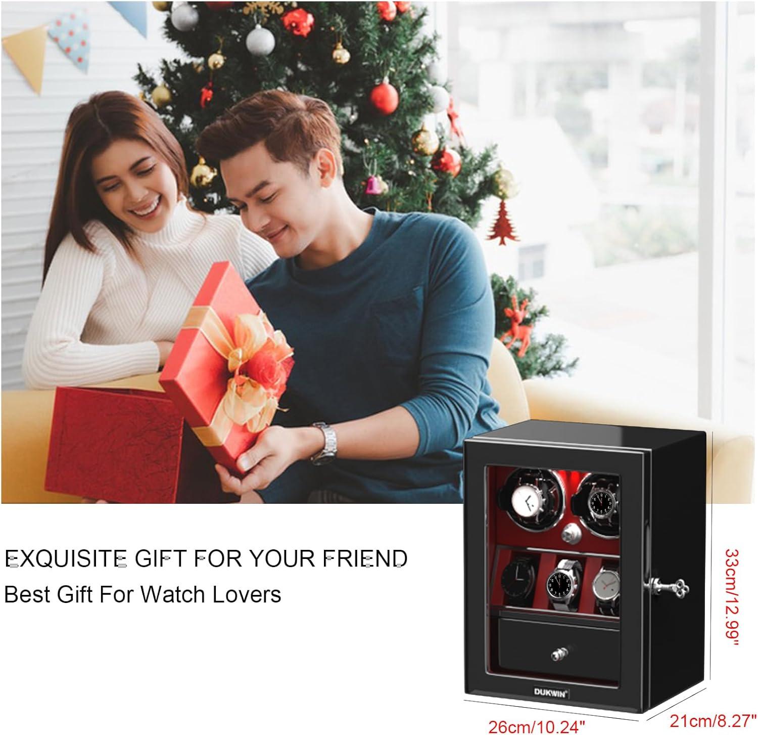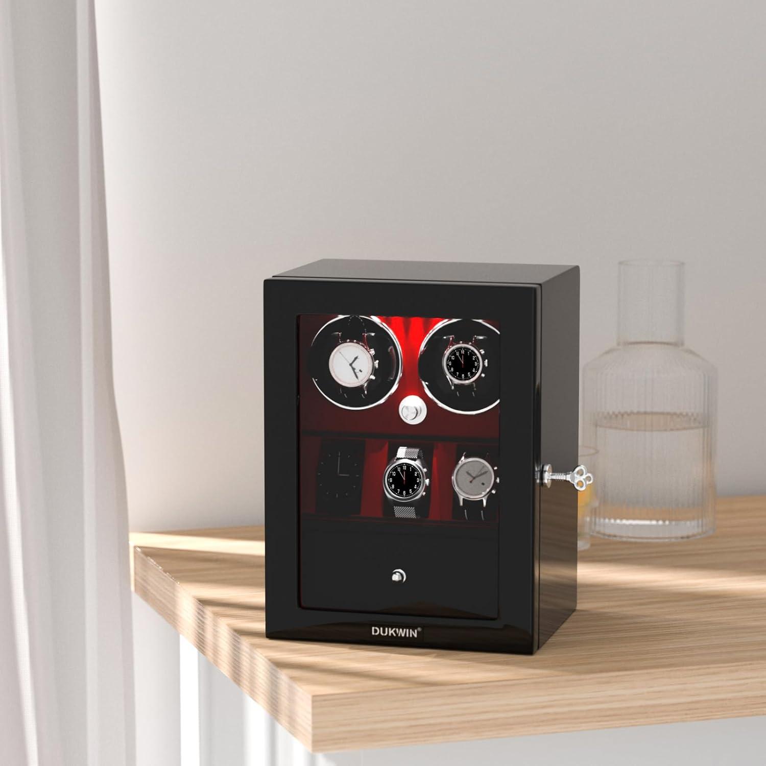DUKWIN Watch Winder for 4/6/8 Automatic Watches, Lockable Winders with Watch Holders and Jewelry Storage, Super Quiet Motor with High-Gloss Finish, Built-in Illumination(Red Watch Winders for 4 Watches)