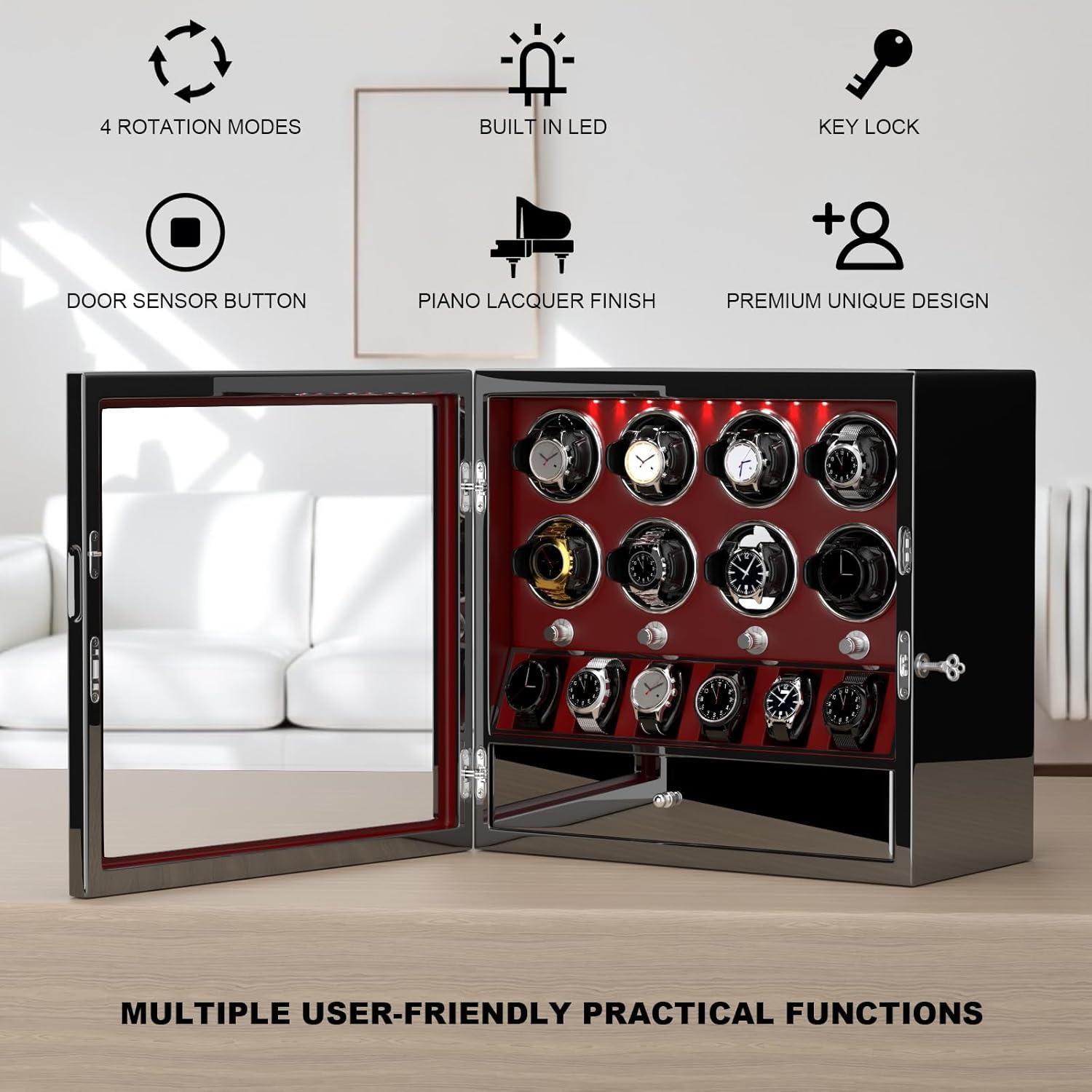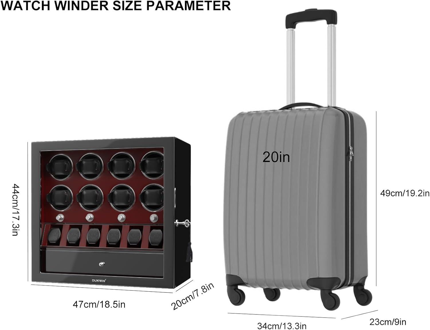 DUKWIN Watch Winder for 4/6/8 Automatic Watches, Lockable Winders with Watch Holders and Jewelry Storage, Super Quiet Motor with High-Gloss Finish, Built-in Illumination(Red Winder for 8 Watches)